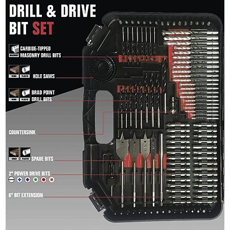 Includes 17 black oxide brad point drill bits: (4) 1/8", (4) 5/32", (3) 3/16", (2) 1/4", (1) 9/32", (2) 5/16", and (1) 3/8", 4 spade bits: 1/2", 3/4", 7/8", and 1", (1) 6" spade bit extension, 21 masonry drill bits: (2) 1/8", (2) 5/32", (2) 11/64", (2) 3/16", (2) 7/32", (3) 1/4", (2) 17/64", (3) 9/32", (1) 5/16", (1) 11/32", and (1) 3/8", and 4 drill toppers: 1/8", 3/16", 1/4", and 5/16"
