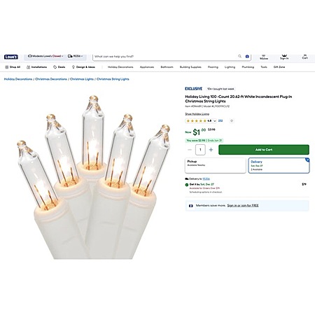 Lowes - Holiday Living 100 -Count 20.62-ft White Incandescent Plug-In Christmas String Lights | L1100119CU12 $1