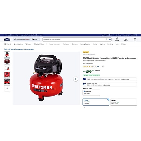 Lowes - CRAFTSMAN 6-Gallon Portable Electric 150 PSI Pancake Air Compressor | CMXECXA02106410 $99