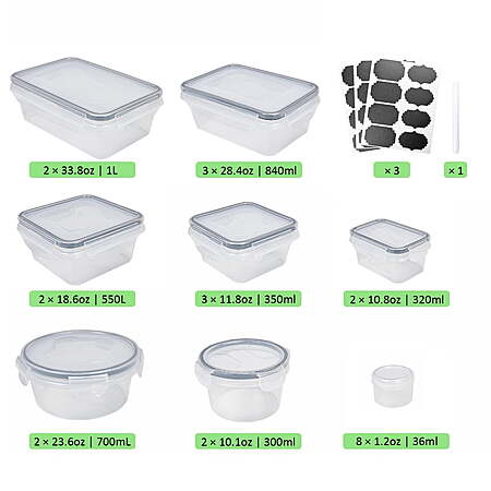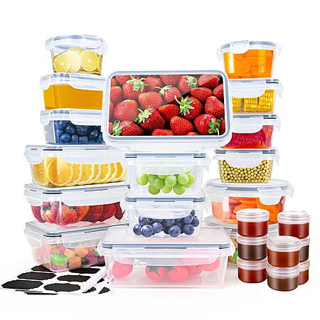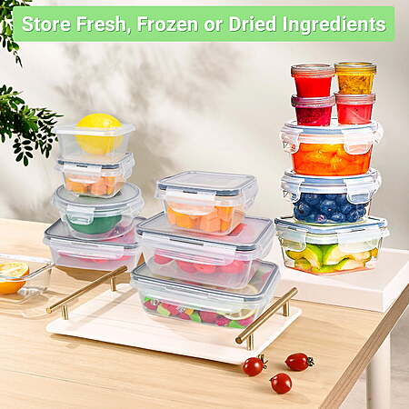 | Product Description: | The TINANA 52 PCS Food Storage Container Set offers versatile, airtight solutions for meal prepping and kitchen organization. Made from durable, BPA-free Triton plastic, these containers are leak-proof, microwave, freezer, and dishwasher safe. With a variety of sizes, including rectangular, square, and round containers, plus small sauce boxes, this set is ideal for storing all kinds of food—wet, dry, or powdered. The stackable, space-saving design makes it perfect for pantry and fridge organization. Complete with labels and a marker, it’s the ultimate solution for keeping food fresh and kitchens tidy. Food Storage Container Set Includes: 24 Containers with 24 Lids, 33.8 oz Rectangle Containers (2x), 28.4 oz Rectangle Containers (3x), 10.8 oz Rectangle Containers (2x),18.6 oz Square Containers (2x), 11.8 oz Square Containers (3x), 23.6 oz Large Round Containers (2x), 10.1 oz Small Round Containers (2x) and 1.2 oz Sauces Box with airtight lids (8x). Comes with label stickers and a marker for easy identification. Easy to Clean: Durable Triton plastic is stain-resistant, odor-proof, and will not chip, crack, or discolor. Simply wipe with a towel or rinse with water for fast cleanup. Space-Saving Design: Stackable containers with airtight lids optimize pantry space. Unique nesting system makes it easy to store neatly in kitchen cabinets, fridge, or freezer. Leak-Proof Snap Lids: Featuring a 4-hinge side locking system and tight silicone seals, these containers are perfect for storing everything from soups and sauces to dry goods like cereal and nuts. Keeps food fresh for longer and prevents leaks. Microwave, Freezer & Dishwasher Safe: These lightweight containers are made for everyday use. Thick, clear walls are built to withstand all kitchen environments while making contents easy to see. Perfect for leftovers, meal prep, or even airplane travel. |