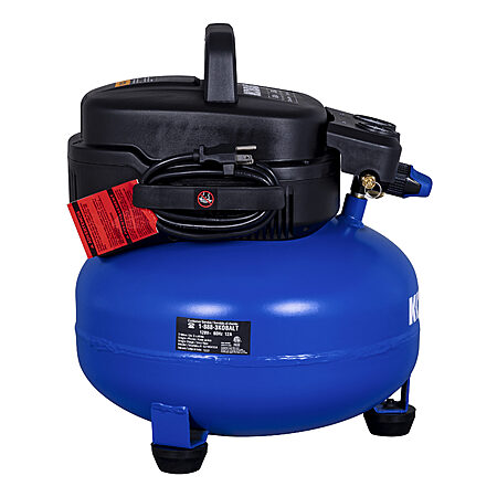 This air compressor is equipped with a pancake style tank, 1.0 HP maintenance free universal motor, 2.6 CFM at 90 PSI air delivery, 150 max. PSI working pressure, two durable quick couplers, an easy to operate drain valve. It can be easily operated with extension cord, no need to worry about low-voltage start issue. It is perfect for trimming and finishing jobs. It also features a strong handle and light weight design, you can easily carry it everywhere to get job done. This kit includes: 6-Gallon Air Compressor, 16 Gauge Finish Nailer, 18 Gauge Brad Nailer, 23 Gauge Pin Nailer, and 25' Air Hose.