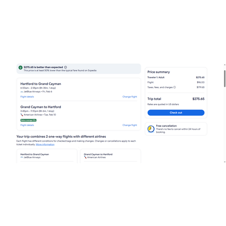 American Airlines and Expedia have round trip airfares travelling from Hartford CT (BDL) to Grand Cayman Island (GCM) for $276-$280, making 1 stop both ways. Stops are at least 3 hrs and some stops are up to 13 hours depending on the flight you choose. My screen shot below shows the 3+ hr stop on 2 different airlines. These are basic economy fares that allow a personal item and a carry-on bag. There is no seat selection and no change. If you are travelling with children, you will be seated together as per their policy.