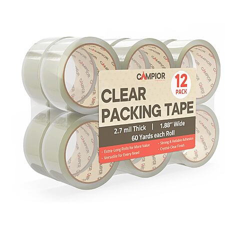 Model: Clear Packing Tape Heavy Duty 12 Rolls, 1.7mil Thickness, Strong Adhesive for Shipping, Moving & Packaging, 1.88" Wide x 60 Yards Per Roll, Smooth Unroll, Clear Finish, Fits Standard Dispensers