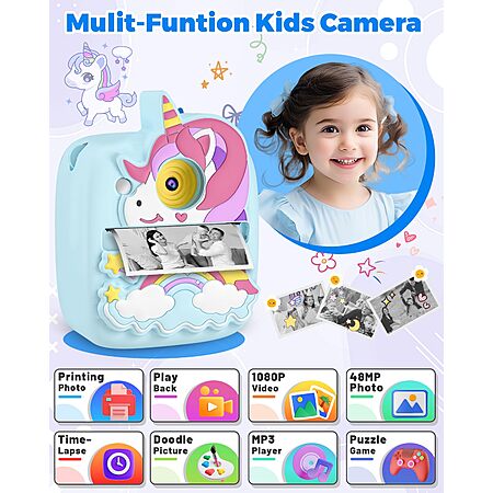 - 【Multifunctional Kids Digital Camera】This instant print camera for kids also as a digital camera.With functions of instant print, capture colorful pictures and HD 1080p videos, Music player, 8X, flash, time-lapse, continuous shooting, puzzle games ect., More creative playing with multiple frames, color filters and mirror effects, inspiring their sense of creativity, kids will enjoy being a photographer.