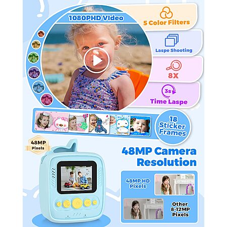 Product Description from Amazon- 【48 MEGA PIXELS & 1080P HD VIDEO】This kids instant camera boasting 48M HD pixels paired with 1080P resolution for vivid photo and video recording. Compared with other instant print cameras which only have 8-12MP, it's greatly improved the clarity of photos. 2.0 inch IPS screen camera providing children better color display. Capture every moment in vibrant detail with 1080P high-definition photography. Let your little one creativity shine with our kids camera.
