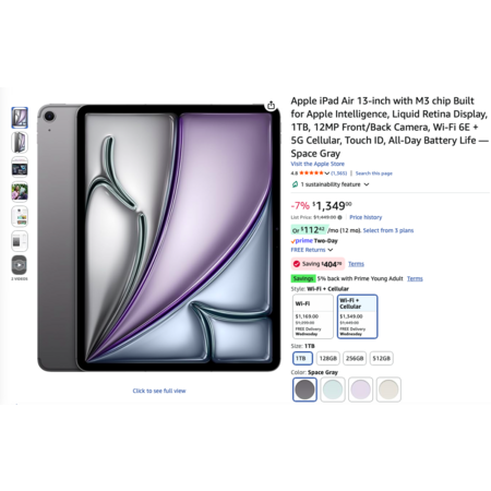 YMMV Apple iPad Air 13" M3 Apple Intelligence, Liquid Retina Display, 1TB, 12MP, Wi-Fi 6E + 5G Cellular, Touch ID, Space Gray for $944.30 AC