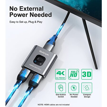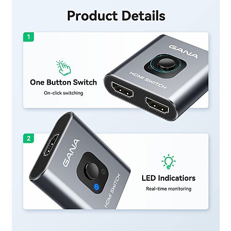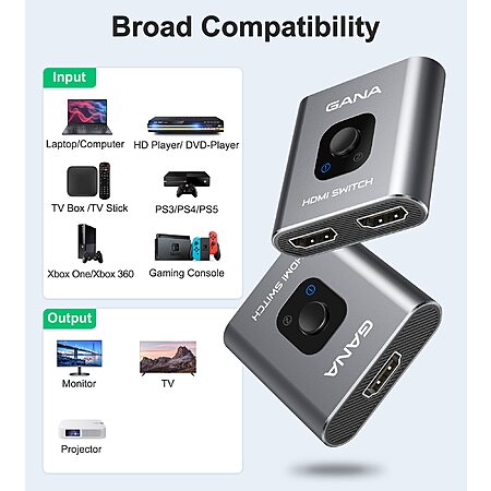 HDMI Switch 4k@60hz Splitter, GANA Aluminum Bidirectional HDMI Switcher 2 in 1 Out, Manual HDMI Hub Supports HD Compatible with Xbox PS5 Blu-Ray Player Fire Stick Roku