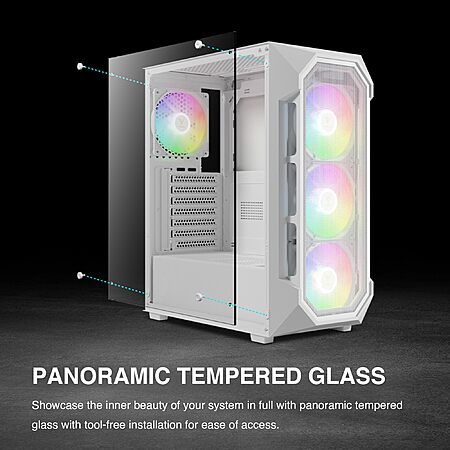 Model: Gamdias AURA GC1 ELITE WHITE ARGB, ATX PC case, Tempered Glass Side Panel, 4 ARGB Fans, Fits: GPU 340mm, and 360mm AIO/Radiator.