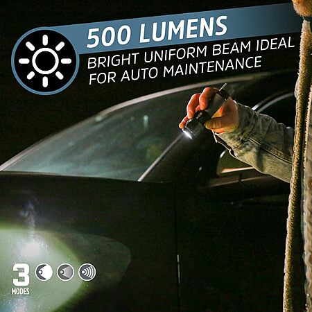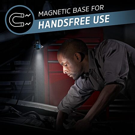 • Magnetic Flashlight: The magnetic base can be positioned under the hood or on the body of your vehicle