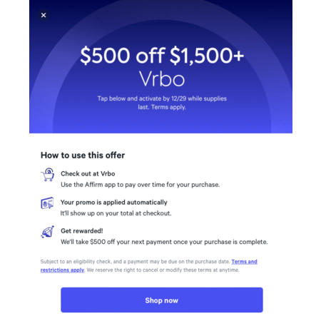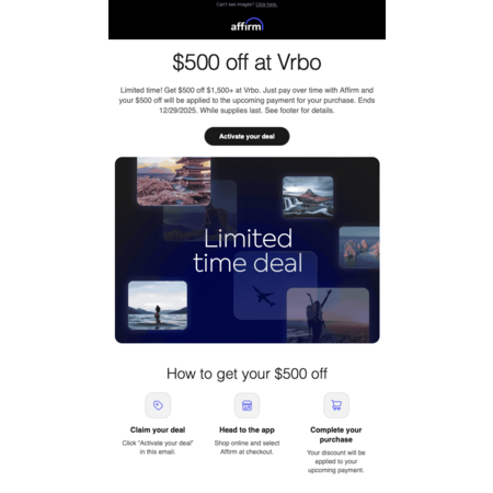 The domain that sent you the email is it VRBO.com or is it affirm.com? Better yet what email address sent you the promo that would help others because they can just copy that address and see if they also received an email from that address