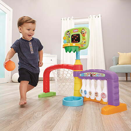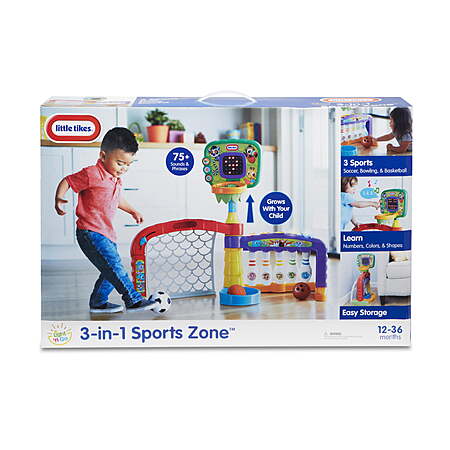 Your little sports star is sure to stay busy with this amazing Little Tikes 3-in-1 Sports Zone!Gift Givers: This item ships in its original packaging. If intended as a gift, the packaging may reveal the contents.PRODUCT FEATURES Dunk, kick and score with fun infant sport center Develop motor skills, hand-eye-coordination Basketball, soccer, bowling Three mode buttons on the backboard grows with baby; learn (Teaches numbers, colors and shapes), move (Lights and sounds encourage movement) and games (Teaches child to follow directions) Light up backboard and sounds activate when shots are made Light up backboard and sounds activate when shots are made WHAT'S INCLUDED Sports Zone Three balls 24.5''H x 14.5''W x 34.5''D For 2 players Age: 9-36 months Plastic Requires 3 AA batteries (not included) Wipe clean Manufacturer's 90-day limited warrantyFor warranty information please click here Imported Size: One Size. Color: Multicolor. Gender: unisex. Age Group: kids.