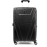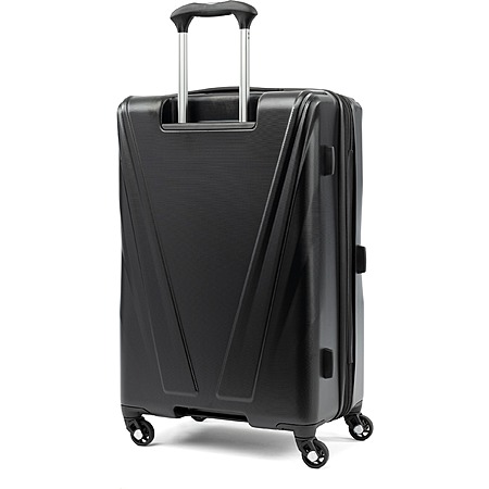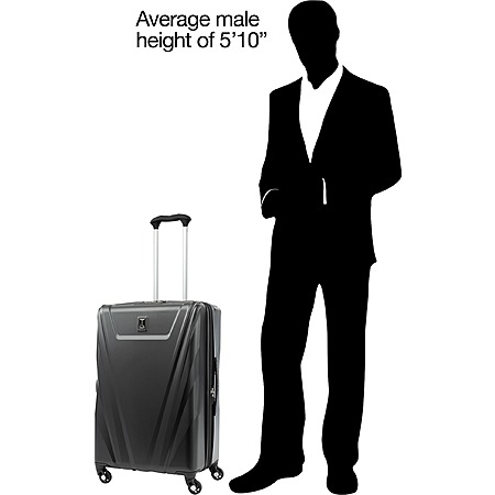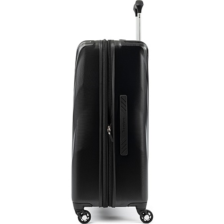 Exterior features: Water-resistant polycarbonate material with a textured surface ensures lightweight durability and protection. A telescoping handle maximizes comfort and control for users of different heights. Four double-wheel spinners glide effortlessly to navigate through busy airports.