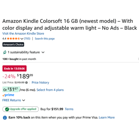 •The promotional credit can be used only toward the purchase of one of the following devices (each, a ?Qualifying Device?) that is shipped and sold by Amazon.com Services LLC and does not apply to other digital products, pre-owned devices, or products sold by sellers other than Amazon.com Services LLC. Offer good while supplies last. Qualifying Devices: Kindle (newest model), All-new Amazon Kindle Paperwhite, All-new Kindle Paperwhite Signature Edition, Kindle Colorsoft Signature Edition, Kindle Scribe, New Kindle Kids Edition, or All-new Amazon Kindle Paperwhite Kids.