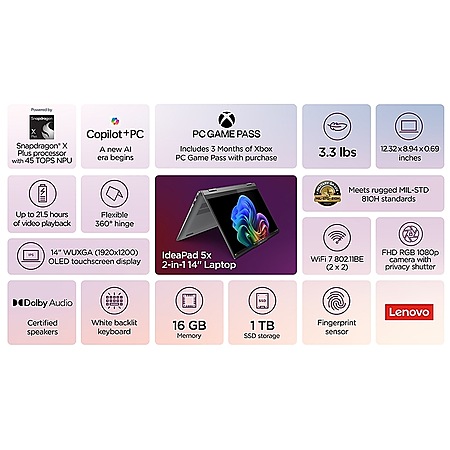 Model: Lenovo IdeaPad 5 14" 2-in-1 Touch-Screen Laptop, Copilot+ PC, Qualcomm Snapdragon X Plus, 16GB RAM, 1TB SSD, Win 11 Home