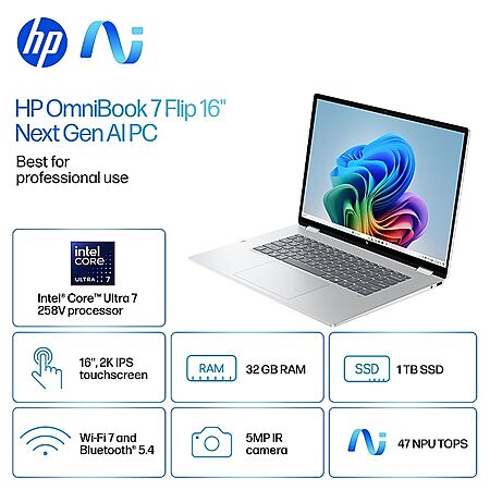 HP OmniBook 7 Flip: 16" FHD+ IPS Touch, Intel Ultra 7 258V, 32GB LPDDR5, 1TB SSD $719.99