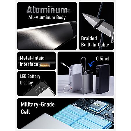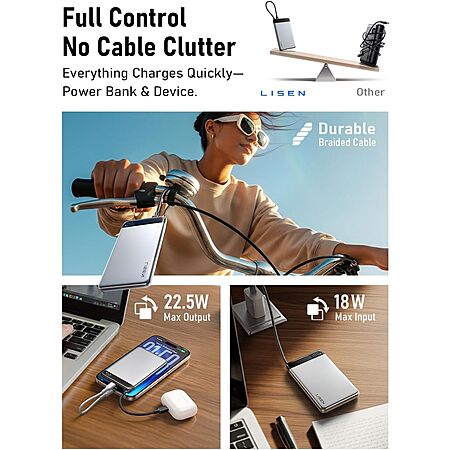 10000mAh LISEN 22.5W Ultra Slim Power Bank w/ Built-In USB-C Cable (Silver)