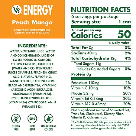 • Six (6) 8 fl oz cans of V8 Energy Peach Mango Energy Drink