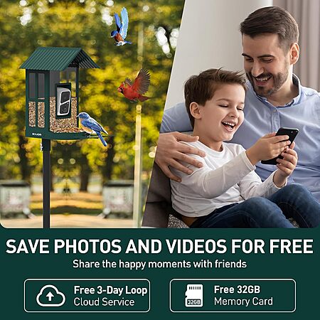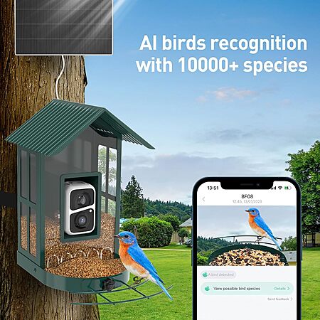 Model: Soliom- Bird Feeder with Camera, 5W Solar Powered, AI Identify Species, Smart Wild Bird Watching, 2K Live View, Instant Arrival Alerts,Large 2.7L Seed Capacity, Metal Squirrel Chew-Proof - BF08 Green