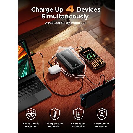 - Portable Charger with Built in Cable: This portable charger power bank includes two built-in cables (iOS & USB-C) plus extra USB-A and USB-C ports, letting you charge up to four devices at once. It powers your iPhone, Samsung, iPad, drones, or handheld gaming consoles with ease. Perfect for sharing with friends, coworkers, or family during travel, commuting, road trips, or daily use—an essential on-the-go charging solution.