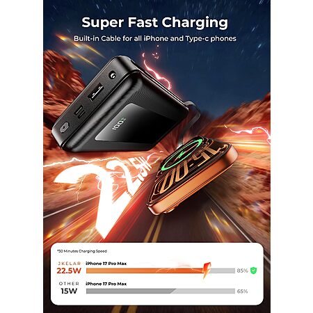 - PD 22.5W Fast Charging – Quick Power, Less Waiting: Equipped with PD 22.5W and QC4.0 fast charging technology, this portable Phone charger powers your phone to 55% in just 30 minutes—3x faster than standard power banks. The Type-C port supports both input and output, ensuring efficient two-way charging when every minute counts.