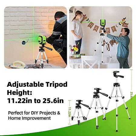 - 【Bonus 25.6" Laser Level Tripod】 The included aluminum laser level tripod has a convenient handle and a stable 3-way pan head, with an adjustable height range from 11.4" to 25.6" to suit various height applications. It comes with a standard 1/4" quick-release plate for easy installation and removal of the laser level in seconds. The 360° swivel function allows tilt and rotation, and you can choose between portrait or landscape positioning, ensuring the perfect angle for every project