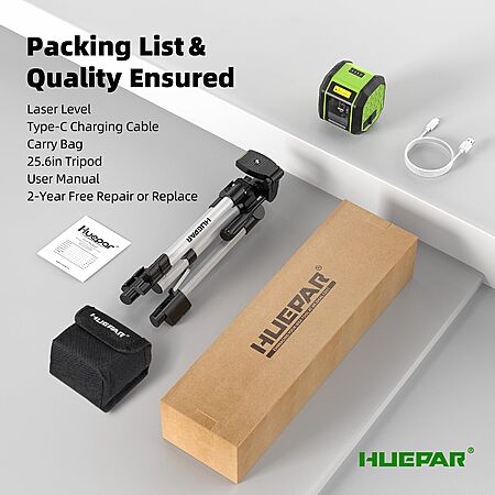 - 【2-Year Warranty & Excellent Customer Support】Huepar not only focuses on the design and innovation of line-level lasers but also the quality and performance of the products. 1-year warranty can be extended to 2 years if registered as a loyal customer (Guides offered on the package box). For any product questions, feel free to contact us. Package includes 1 x 100ft level tool, 1 x aluminum extendable tripod, 1 x Type-C charging cable, 1 x Carry Bag, 1 x User Manual