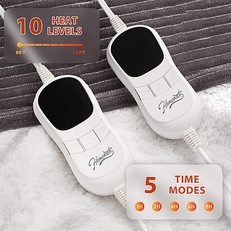 - EASY TO USE: Homemate heated blanket have 10 heat levels,1/2/4/6/8 hours auto shut off.Temperature range is 86-122°F.Very convenient to use,even the elderly,the sick,and the disabled can use it easily.Power Cord is 16.7 feet,this long cord makes the use of the blanket more flexible,can be used on the bed,on the sofa,can be used in the study and office,very convenient.