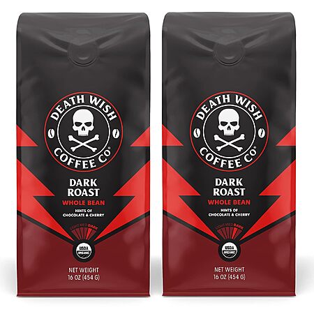 Death Wish Coffee, Whole Bean Dark Roast - USA Organic Coffee Beans Bundle/Bulk - Fair Trade Arabica & Robusta - 16 Ounce (Pack of 2) - $15.74