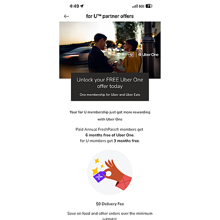 - Paid Annual FreshPass® members get 6 months free of Uber One. (freshPass is Albertson/Safeway's grocery delivery service)