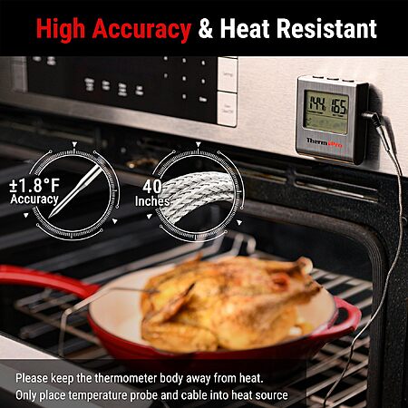 - Easy operation: Accurate grill meat thermometer with 6.5 inches food grade stepdown tip design stainless steel probe to get temperature precisely and quickly; 40 inches stainless steel mesh cable connects thermometer to base, outside of oven
