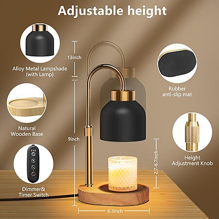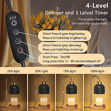 - 【ADJUST HEIGHT AND BRIGHTNESS TO CONTROL MELTING SPEED】: Candle warmer has adjustable height and brightness. With the rotating screw in the center of the rod, you can quickly adjust the height between 9-13inches. Meanwhile, it has four brightness modes (same for temperature) (25%-50%-75%-100%) and three timer modes (2H/4H/8H) to meet your needs for different occasions. Interestingly, you can use different height brightness (temperature) to control the candle melting speed