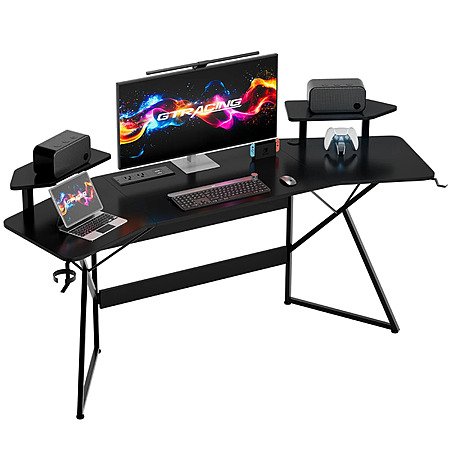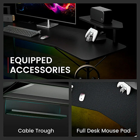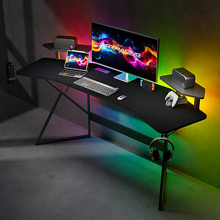 GTRACING Wing-Shaped Gaming Desk with Power Outlet, RGB LED Lights, Removable Monitor Stand, Full-sized Mouse Pad, Headphone Hook & Cup Holder, Black