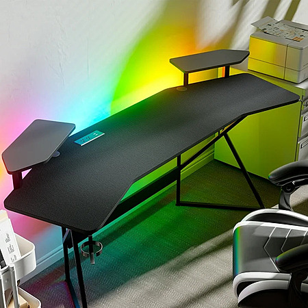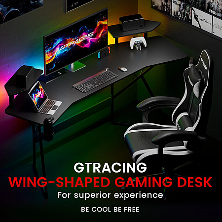 About this item- Aerodynamic Desktop: Features an innovative aircraft wing-shaped desktop design, maximizing space for gaming gear and accessories with a sleek, aerodynamic look.