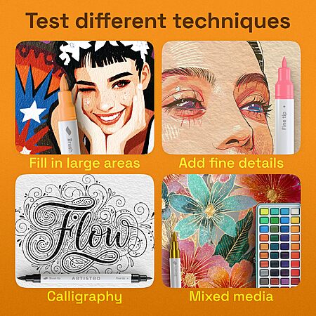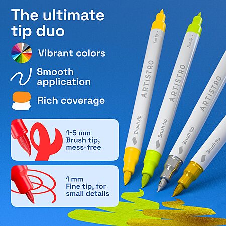 - BRUSH + FINE DUAL TIP: Our acrylic paint markers come with 2 tips for 2x the fun. The acrylic paint pens are equipped with a 1-5 mm brush tip and a 1mm fine tip. These paint pens are perfect for calligraphy, sketching and coloring.