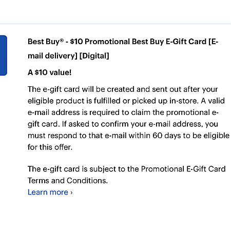 Note: The e-gift card will be created and sent out after your eligible product is fulfilled or picked up in-store. A valid e-mail address is required to claim the promotional e-gift card. If asked to confirm your e-mail address, you must respond to that e-mail within 60 days to be eligible for this offer.