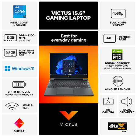 HP Victus 15.6 inch FHD 144Hz IPS Win 11 Gaming Laptop Intel Core i5-13420H 16GB RAM 512GB SSD RTX 4050 MicaSilver