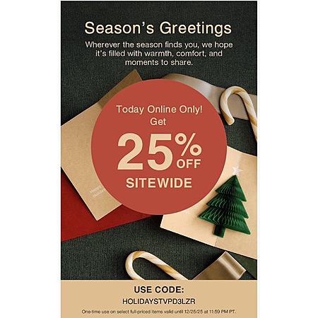 Muji USA TODAY Online Only Get 25% Off Sitewide on select Full priced Item USE CODE: HOLIDAYSTVPD3LZR free shipping on $60+ order