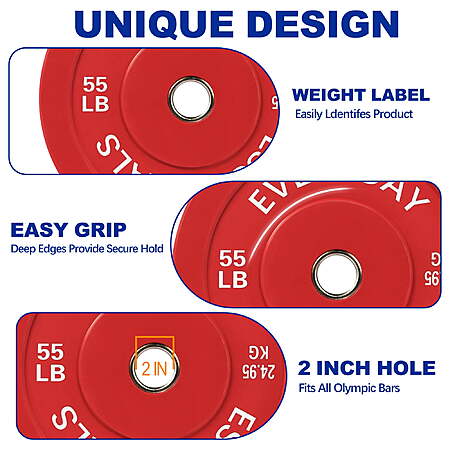 | Product Description: | BalanceFrom Olympic Bumper Plates - Sold in Pairs or Sets - Available in Black or Color Whether you're a seasoned lifter or just starting your fitness journey, our bumper plates are the perfect addition to your home or commercial gym. Crafted for durability, ease of use, and versatility, these plates offer a wide range of weight options to suit your fitness needs. Here's why they're your go-to choice: Sold as Pairs and Sets: Pairs Available in: 10, 15, 25, 35, 45, and 55 pounds Sets Offered: 160 Pounds Set: 2x10LB + 2x25LB + 2x45LB Plates 210 Pounds Set: 2x25LB + 2x35LB + 2x45LB Plates 260 Pounds Set: 2x10LB + 2x15LB + 2x25LB + 2x35LB + 2x45LB Plates 370 Pounds Set: 2x10LB + 2x15LB + 2x25LB + 2x35LB + 2x45LB + 2x55LB Plates Key Features at a Glance: 2" Inner Ring Diameter: Compatible with Olympic barbells. Total Diameter: 17.75": Ensures a secure fit on the bar and provides stability during lifts. High-Density Rubber Plates: Designed for durability, they can withstand the demands of intense workouts. Solid Stainless Steel Insert: Provides a secure and snug fit on the barbell, preventing shifting during exercises. Pairs or Sets: Choose individual pairs or opt for a complete set to kickstart or expand your weight collection. Our bumper plates offer consistent and reliable performance, perfect for powerlifting, Olympic lifting, and cross-training. Elevate your fitness routine with quality and versatility - choose our bumper plates for your next workout. BalanceFrom Steel Hub Olympic Bumper Weight Plate Colored, 55 lbs, 2 Pack Model: EEBP-2GCLR55P 2" inner ring diameter for compatibility with Olympic barbells Total diameter of 17.75" for a secure fit and stability during lifts High-density rubber plates designed for durability, ideal for intense workouts Sold as pairs, available in various weight options Solid stainless steel insert ensures a snug fit on the barbell, preventing shifting during exercises |