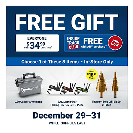 Harbor Freight, Free gift for ITC members with any purchase, non-ITC must spend $34.99, Dec 29-31, ammo can, hex keys, step drill bits