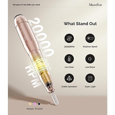 - PC120I Multifunctional USB Nail Drill Kit: Comes with 20,000RPM powerful rotary motor and 3/32" mental nail drill bits, this electric nail file can be used for all-around shaping, buffing, grinding, polishing, removing for acrylic nails, poly gel nails, artificial extension nails, thick nails, builder gel, dip powder, fake nails, natural nails, and cuticle dead skin.