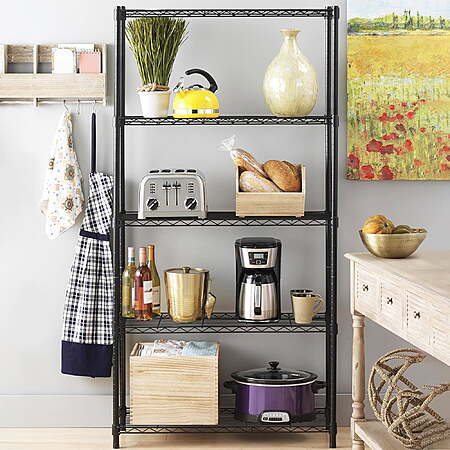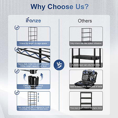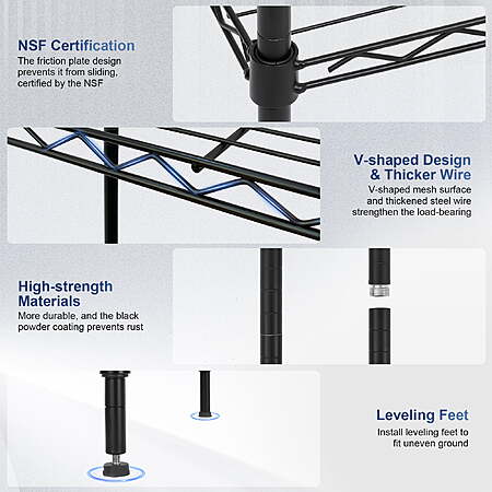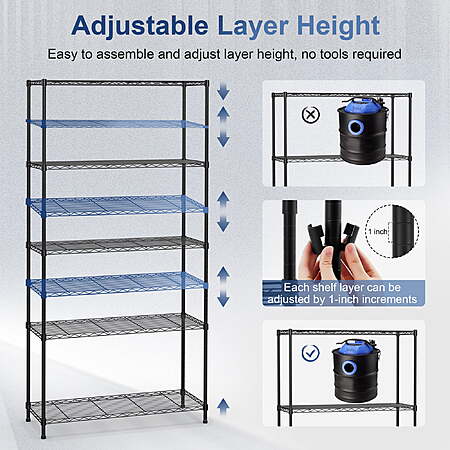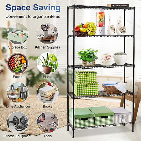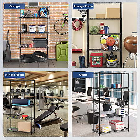 | Product Description: | 【EASY TO ASSEMBLE】No tools are required to install the Qunler garage storage shelves, you only need 15 minutes to install the 5-tier wire shelving unit. 【HIGH-QUALITY MATERIAL】This Qunler metal shelf is made of heavy steel, so it has an extremely strong load-bearing capacity. The metal rack is covered with a black powder coat finish that not only has a smooth finish but also resists water, rust, or corrosion. Placing the shelving unit in your kitchen or laundry room is no problem. 【750LBS LARGE CAPACITY DESIGN】Each shelf holds up to 150 pounds, evenly distributed. Our kitchen rack is 72"H x 36"L x 14"W in size, which can hold a lot of things, and the shelving units and storage are good helpers to keep the space tidy. There are five layers of cells to help you store unused items, which can meet all your storage requirements. 【ADJUSTABLE LAYER HEIGHT】The metal shelves unit can adjust the shelf up and down, and adjust the height of the shelf according to the size of the items according to your needs. simply snap clips onto the posts at your preferred height and then slide the metal shelf down the posts until they firmly rest on the clips. 【WIDELY APPLICABLE】The utility shelves are suitable for many places, such as storage rooms, closets, warehouses, basements, living rooms, offices, and so on. Comes with easily adjustable clips to secure and stabilize each shelf. Versatile shelving is perfect for garage shelving, kitchen storage, and pantry shelving. Specification: Shelf Name: 5-tier storage rack Shelf Material: Steel Shelf Color: Black. Number Of Tiers: 5 tier Age group: Adults Assembled Shelf Rack Dimensions: 72"H x 36"L x 14"W Package Included: 1 x 5-tier Metal storage rack 1 x User manual Related Keywords: Wire shelving unit, storage shelves, shower shelves, bookshelf, locker shelf, Wire Shelving Rack Qunler 5-tier metal storage shelf wire rack offers handy storage space and easy access to tools and supplies. Easily and quickly assemble: no tools needed, the shelf can be finished in 15 minutes. Durable steel construction with a black finish, excellent rust resistance, and oxidation resistance. Wire Shelf dimensions: 36"Length x 14"Width x 72"Height Sturdy metal wire shelf with 750lbs total weight capacity: Each shelf layer holds up to 150 pounds, evenly distributed. Adjustable shelf layer height in 1-inch increments for easy customizing, 4 leveling feet for stability. Multi-purpose versatility: Use the shelf in a garage, laundry room, kitchen, playroom, or other living or workspace. Number Of Tiers: 5 tiers Age group: Adults |
