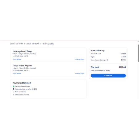 The next lower airfare is on ANA for $637 that includes one free checked bag. So if you're budget-conscious and only travel with a personal item and a carry-on bag, go with ZIPAIR.