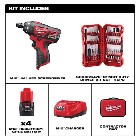 Milwaukee M12 12V 1/4" Hex Screwdriver Kit w/ 4x 1.5Ah Batteries & Bit Set (2401-22-48-11-2411-48-32-4023) on sale for