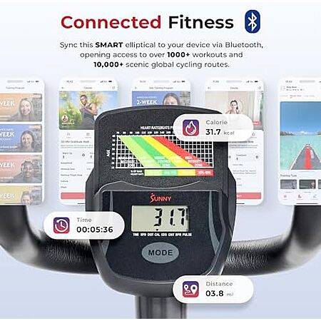 $229.43: Sunny Health & Fitness Smart Upright Elliptical w/Pulse Sensor Built-in at Amazon