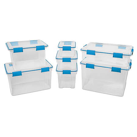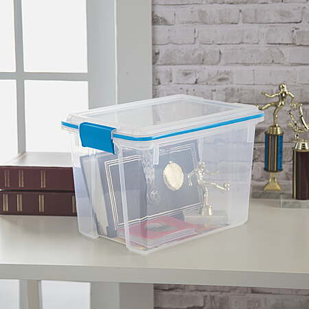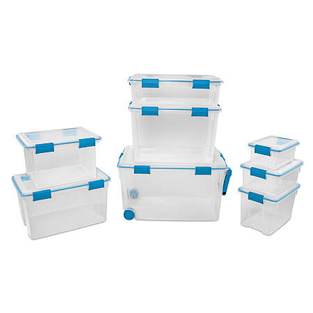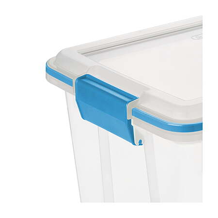 | Product Description: | Sterilite's Gasket Box line is the ideal storage solution for keepsakes, photographs, important documents, linens, and other items that need to be stored away and protected. Gasket Boxes offer a gasketed seal to safeguard items from both air and moisture, keeping those special belongings safe from the elements, dust and pests. Durable, tight-fitting latches keep the lid secured to the base, and the clear lid and base allow contents to be easily identified, without opening the lid. The 20 Quart size is ideal for organizing school projects, paperwork and photographs that need to be protected, and fits conveniently on 16" wire closet shelving, making it ideal for organizing and storing small items in the closet. The gasketed seal also helps to keep pet food and other bulk foods fresh longer. The Gasket Box line has eight sizes, ranging from 7.5 Qt to 120 Qt, providing a variety of storage options for those items that need to be kept safe as well as for longer term storage needs. The 12 Qt and 20 Qt Gasket Boxes use the same lid, allowing both the shallow and deep sizes to be stacked in same footprint. The overall assembled dimensions of this item are 16 1/8" L x 11 1/4" W x 10 7/8" H. Sterilite 20 Quart Gasket Box, Weather-Resistant Clear Storage Bin with Lid, Blue, 6 Count Outside Dimensions: 16 1/8" x 11 1/4" x 10 7/8" Interior Dimensions at bottom: 12" x 8 5/8" x 9 5/8" Ideal solution for those items that need to be stored away and protected Gasketed seal safeguards items from air and moisture, dust and pests Durable, tight-fitting latches keep the lid secured to the base Clear base and lid allow for easy identification of contents, without having to open it BPA-free and phthalate-free |