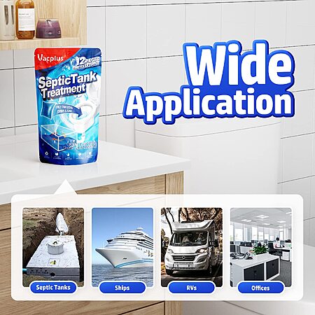 Vacplus Septic Tank Treatment 12 Pcs for 1-Year Supply, Dissolvable Packs with Easy Operation, Durable Biodegradable Enzymes for Wastes, Greases & Odors, Blue, 2X Efficiency