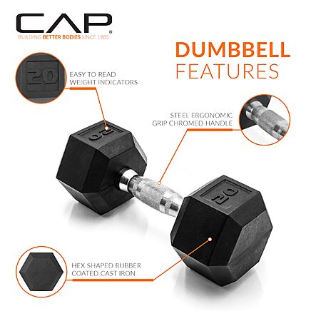 CAP Barbell 20 LB Rubber Coated Hex Dumbbell Hand Weight - Pair | Chrome Handle $38.99