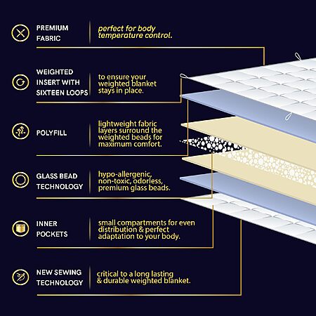 - [Innovative Design] The 7-layer system design adapts to the curve of your body for optimal comfort and the 2x2-inch smallest sections allow for more equitable weight distribution. It includes more cooling glass beads and less fiberfill for enhanced temperature regulation for hot sleepers or warm climates. In addition, a three-dimensional lock bead stitching method prevents leaking of beads. It has the finest stitching (0.25mm per stitch) to avoid movement of weight between compartments.