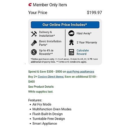 Costco online has Kitchenaid over the range multifunction microwave with built in air fryer on clearance for $199.97, which includes install and haul away of your old appliance.