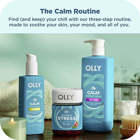 | Product Description: | We just want a little Peace, Please. Bring all of you back into balance with this expertly curated wellness kit that turns your daily shower into a soothing self-care ritual, thanks to CALM Mood + Skin body care and our bestselling Goodbye Stress gummies. Cleanse with CALM body wash, a creamy, non-stripping gel cleanser designed to soothe dry skin and ground your mood. Powered by clinically studied skincare ingredients, this dermatologist-tested formula is proven to repair your skin barrier with OLLY Vitamin Complex, infused with a blend of hyaluronic acid, adaptogens, and vitamin B3. Moisturize afterwards with CALM body serum, made with the same OLLY Vitamin Complex and scent, to add extra staying power to your hydration and fragrance. The grounding, spa-like scent of CALM is Comforting Eucalyptus Amber was developed with neuroscientists and proven to quiet your mood. For the full routine, take Goodbye Stress, made with GABA and L-Theanine, before or after you shower to enter “zen” mode. Skin-soothing, mood-morphing, and totally OLLY—this is your chill, bottled. Find (and Keep) Your Inner Chill: Peace, Please is an expertly curated wellness routine to bring all of you back into balance. CALM Mood + Skin: CALM body wash and serum are scientifically formulated to repair your skin barrier and transform your mood. Goodbye Stress: Our bestselling Goodbye Stress gummies are made with GABA and L-Theanine to help you keep calm and stay alert The Full Routine: Cleanse with CALM body wash and enjoy a light fragrance that lasts post-shower. Moisturize with CALM body serum for extra staying power and hydration. For the full routine, take Goodbye Stress pre-or-post shower and enter “zen” mode. Clinically Studied, Vitamin-Infused Skincare: Proprietary OLLY Vitamin Complex, made by skincare experts with hyaluronic acid, adaptogens, and vitamin B3, repairs and soothes dry skin. Scientifically Proven Scents: Calming fragrance developed with neuroscientists and proven to ground your mood. These statements have not been evaluated by the Food and Drug Administration. This product is not intended to diagnose, treat, cure or prevent any disease. |